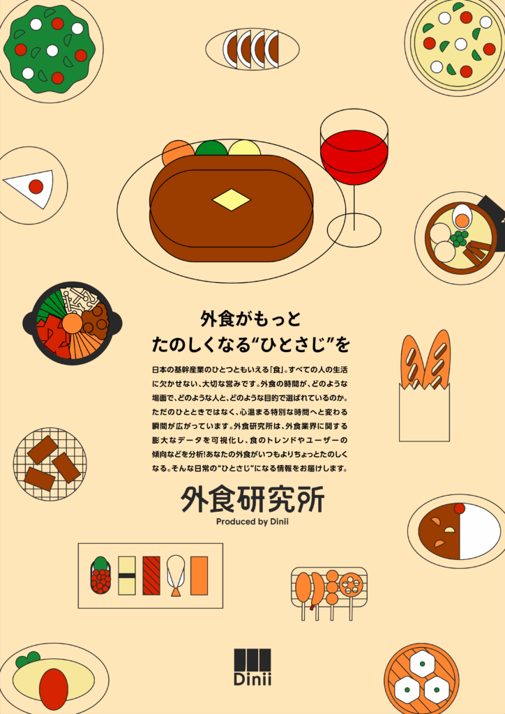 ダイニーのシンクタンク立ち上げにおいて、私たちはダイニーデザインチームと共にクリエイティブを担当しました。日本の基幹産業のひとつであり、誰にとっても欠かせない営みである「食」。私たちは、外食という時間が、どのような場面で、どのような人と、どのような目的で選ばれているのかを丁寧にひも解きます。膨大な業界データを可視化し、外食がいつもより楽しくなるような気づきと情報を発信していきます。