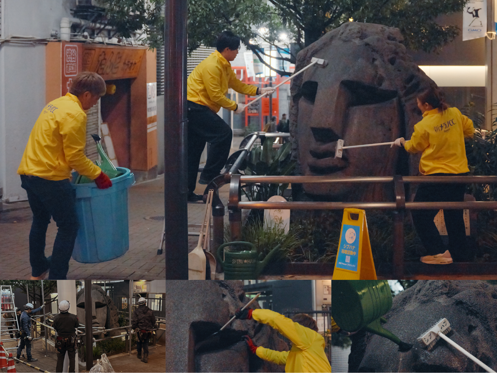 仮囲いにしていたもうひとつの理由。ロート製薬社員による清掃活動を実施し、主役であるモヤイ像に敬意を表しました。 結果として、物理的にも“少しだけ明るくなったモヤイ像”が翌日、渋谷の街に戻りました。