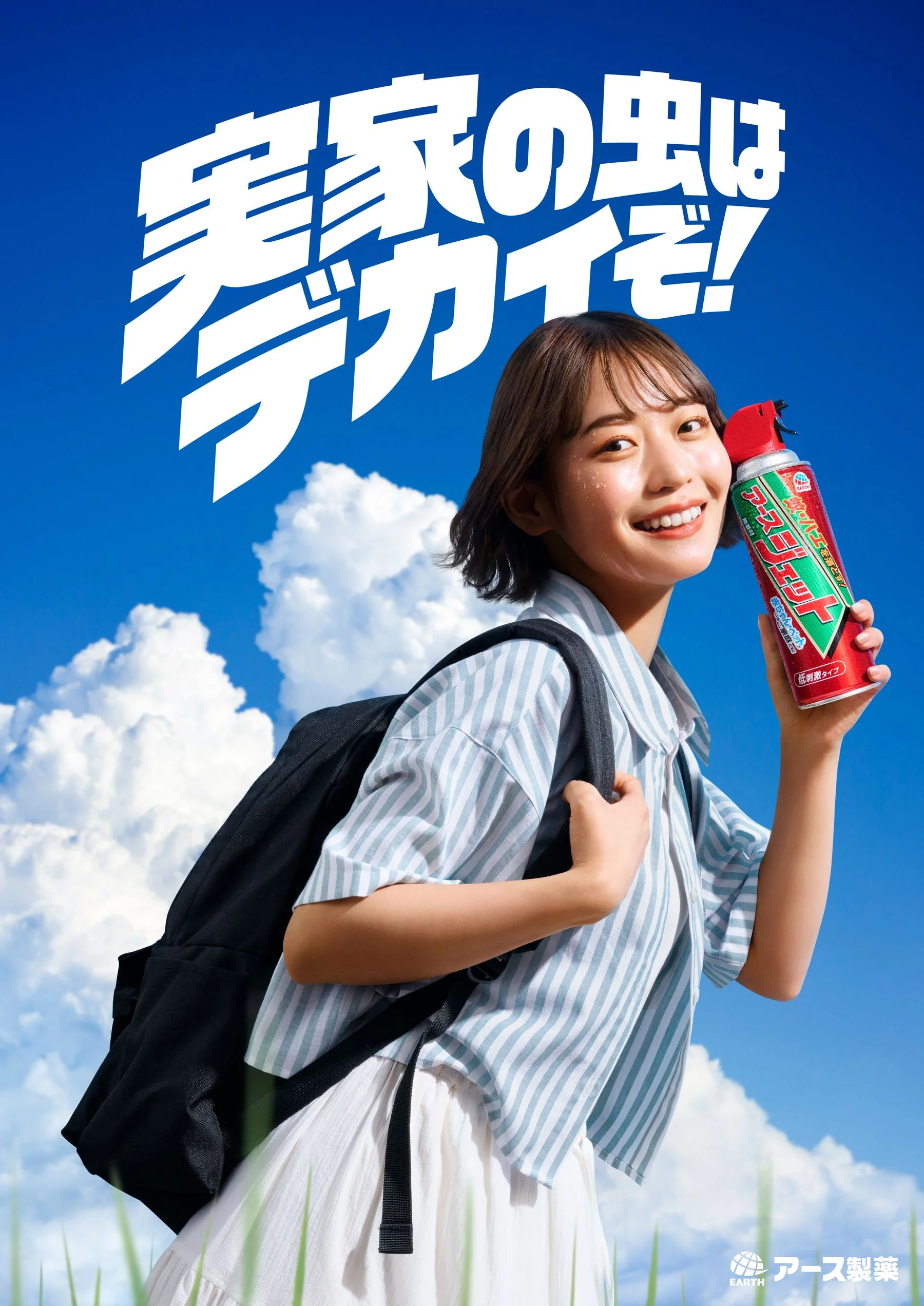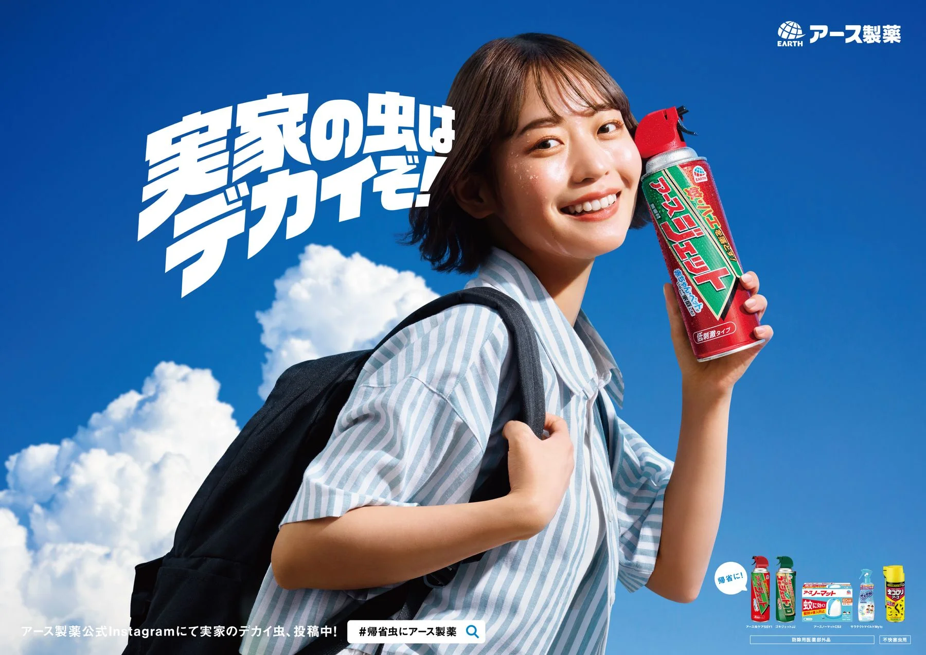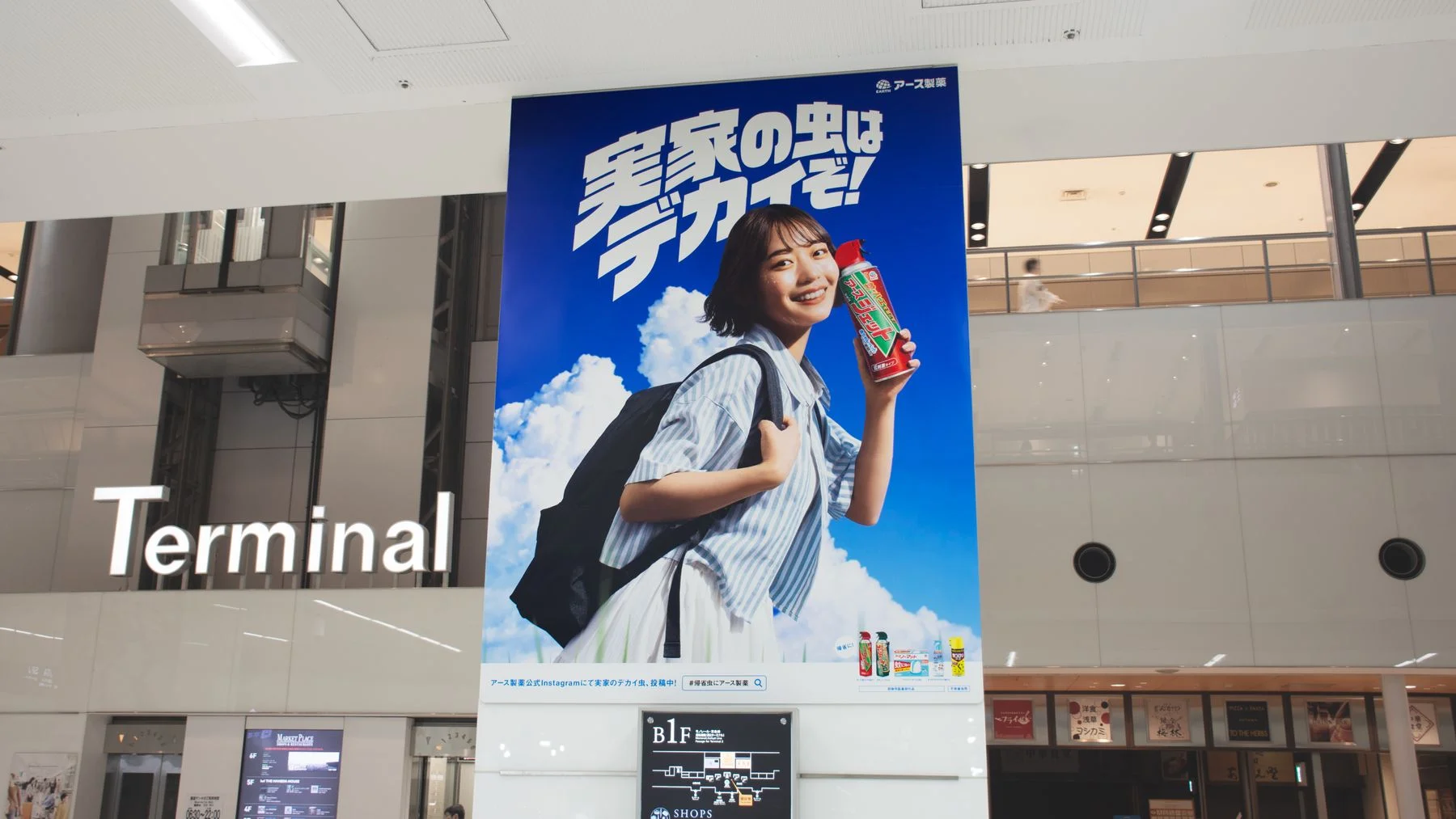 虫ケア用品の夏コミュニケーション施策。「帰省する皆さんに実家の虫のデカさを思い出して欲しい...」というアース製薬の思いをもとに、ビジュアルを制作。一見すると、清涼飲料のような爽快感の溢れる広告ですが、よく見てみると...。思わずツッコミたくなるような違和感を演出しました。帰省シーズンの8月に合わせて、羽田空港、四国/九州のターミナル駅に広告を掲出。誘導先のInstagramでは掲出期間にフォロワーから「デカい虫」の写真を募集しモザイクをかけて投稿。虫ケア用品をプレゼントする企画として、ユーザーとの交流の場を創出しました。