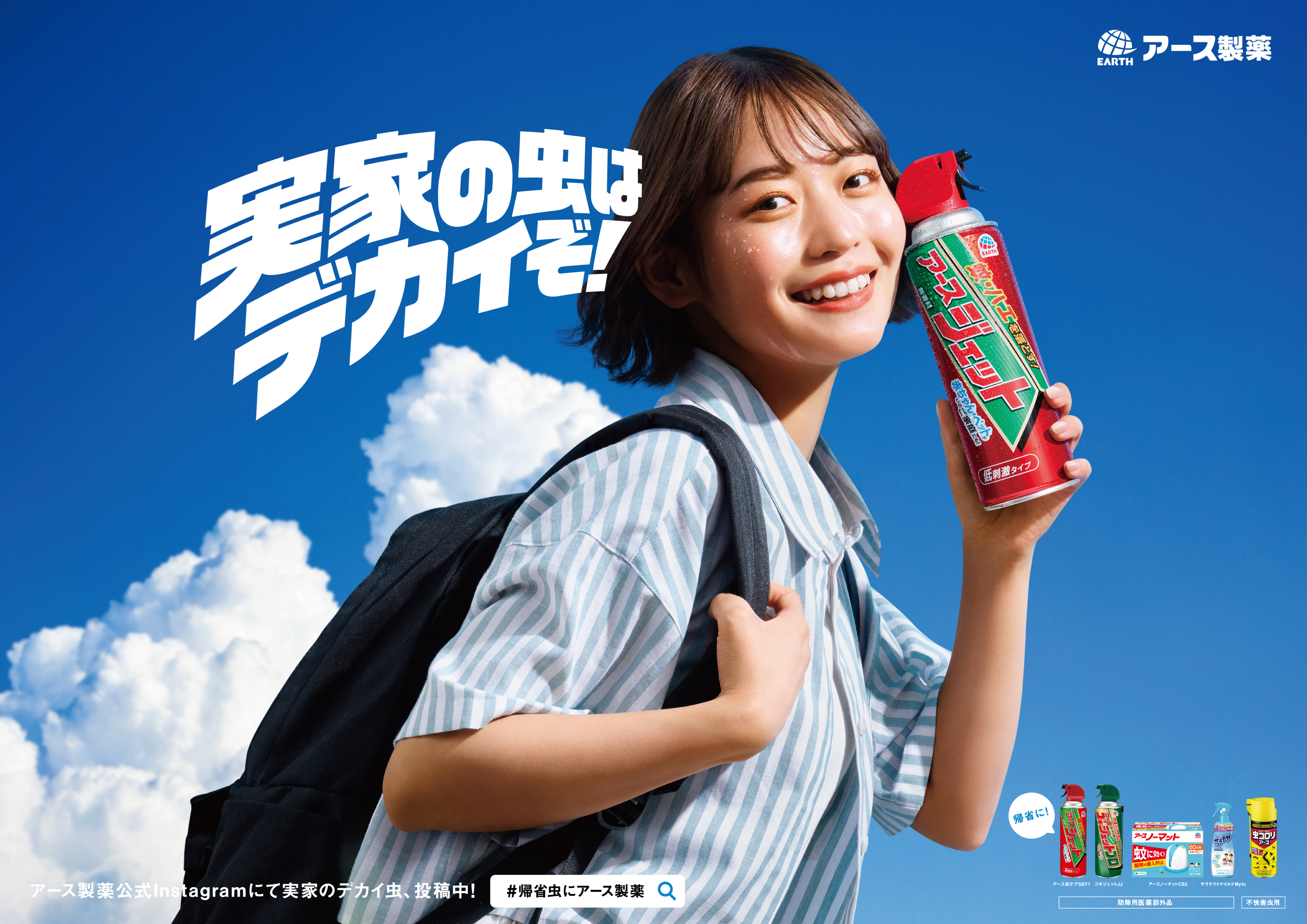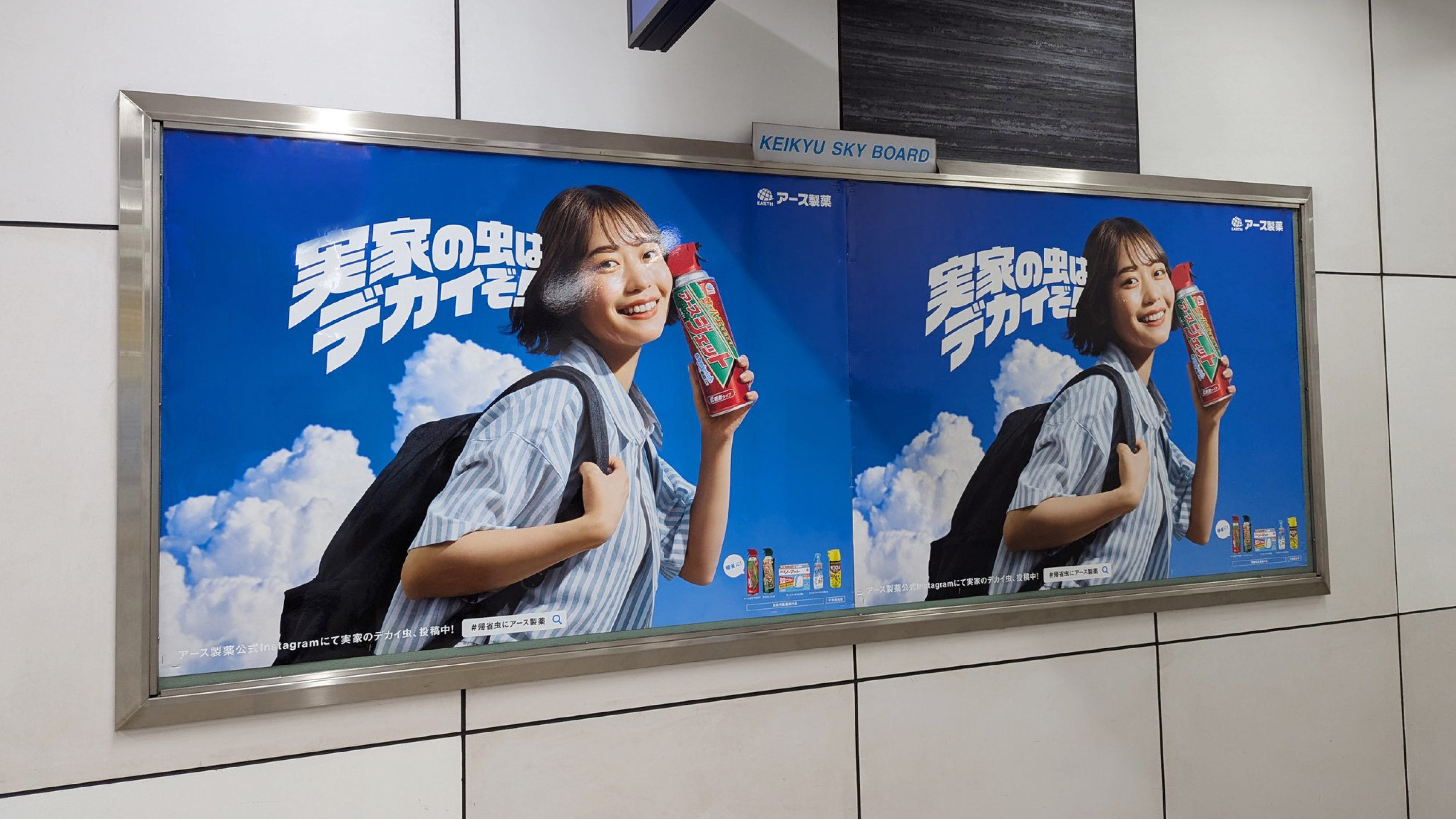 虫ケア用品の夏コミュニケーション施策。「帰省する皆さんに実家の虫のデカさを思い出して欲しい...」というアース製薬の思いをもとに、ビジュアルを制作。一見すると、清涼飲料のような爽快感の溢れる広告ですが、よく見てみると...。思わずツッコミたくなるような違和感を演出しました。帰省シーズンの8月に合わせて、羽田空港、四国/九州のターミナル駅に広告を掲出。誘導先のInstagramでは掲出期間にフォロワーから「デカい虫」の写真を募集しモザイクをかけて投稿。虫ケア用品をプレゼントする企画として、ユーザーとの交流の場を創出しました。