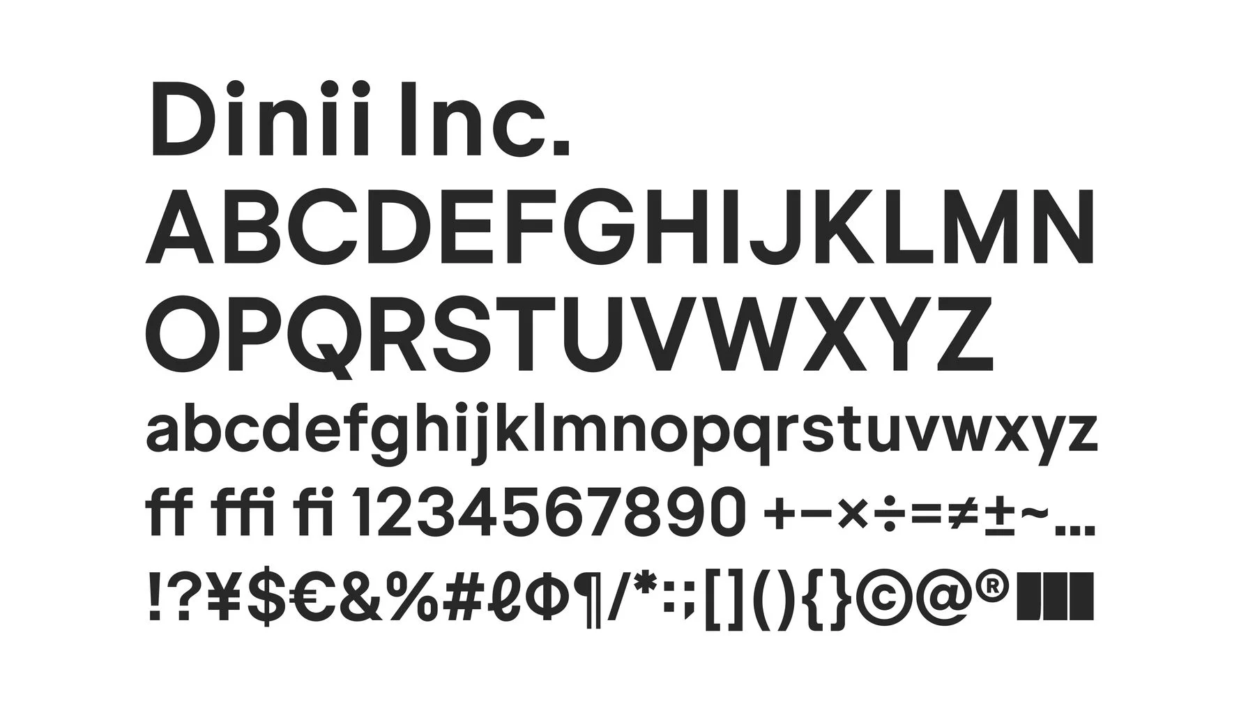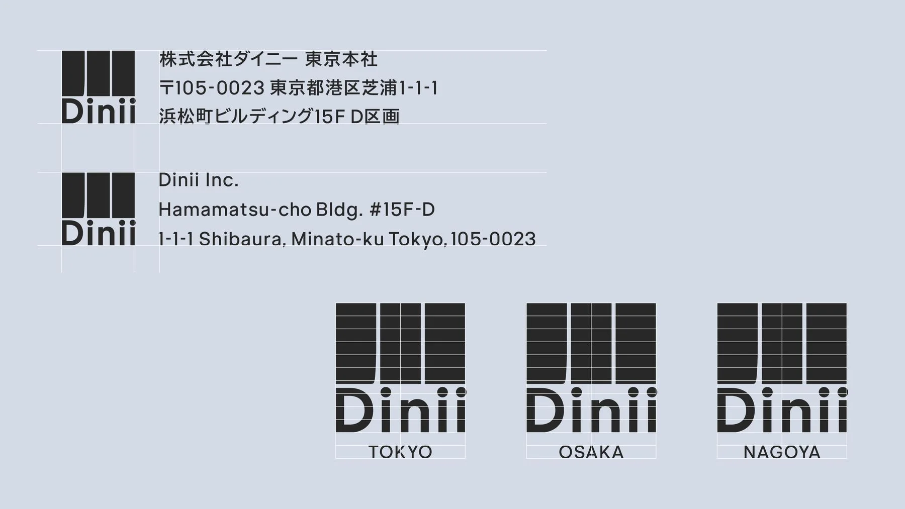ロゴタイプは「dinii」から「Dinii」へと表記を改めることで、企業のスケールアップ感を演出。書体は既存ロゴの正円と直線で切り出された幾何学な構造を継承。Diniiのロゴタイプをアルファベットに展開し、オリジナルタイプフェイスを開発しました。