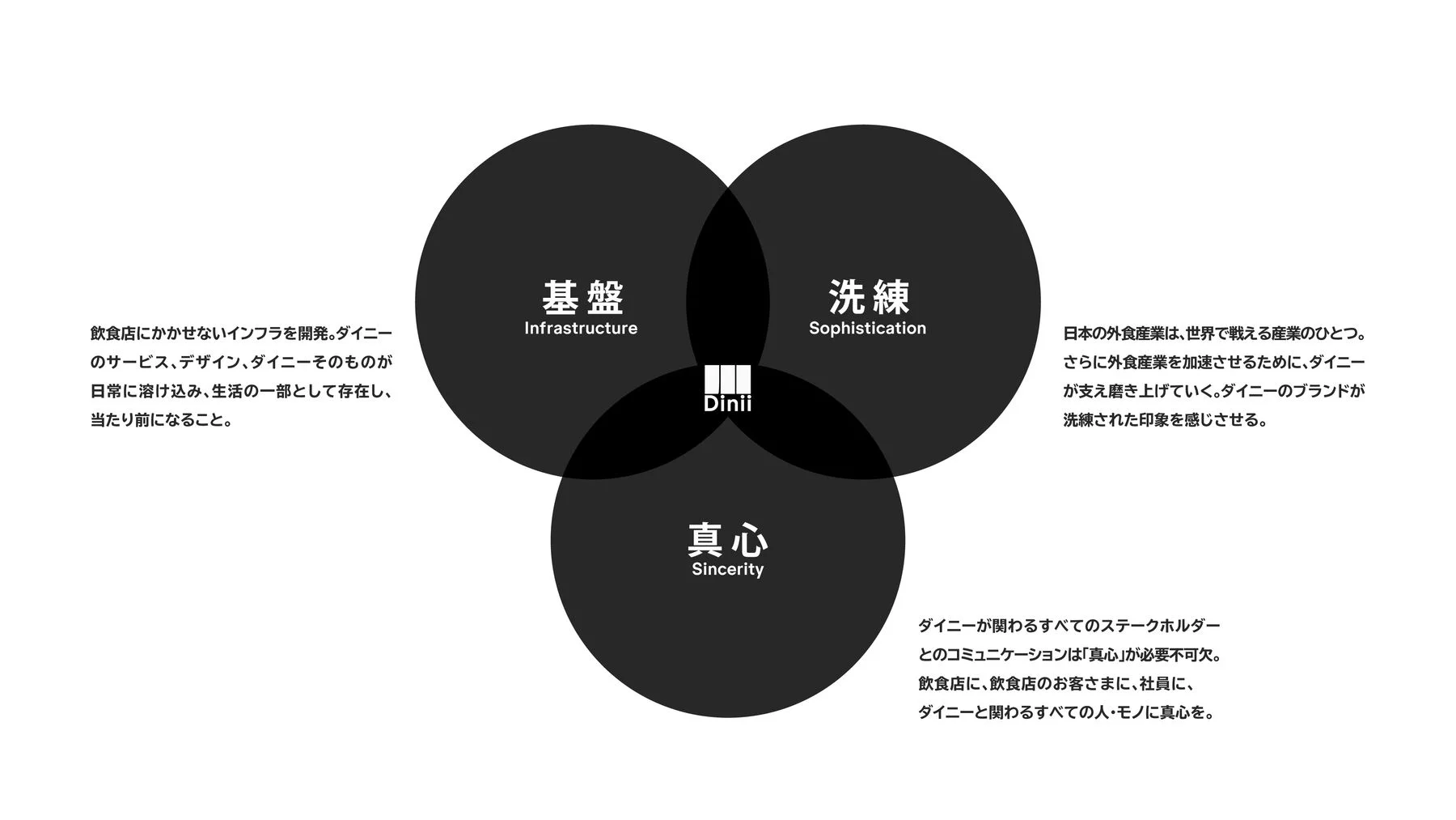 これまでのダイニーは主軸プロダクトであるモバイルオーダーの印象が強く、これからのフェーズで目指していく外食産業を支えるインフラとしての存在であることを体現するには、ブランドイメージ、ビジュアル共にギャップを抱えていました。また、採用面でもテック企業としての存在感を示すことで必要人材に向けた適切なアプローチを考える必要がありました。