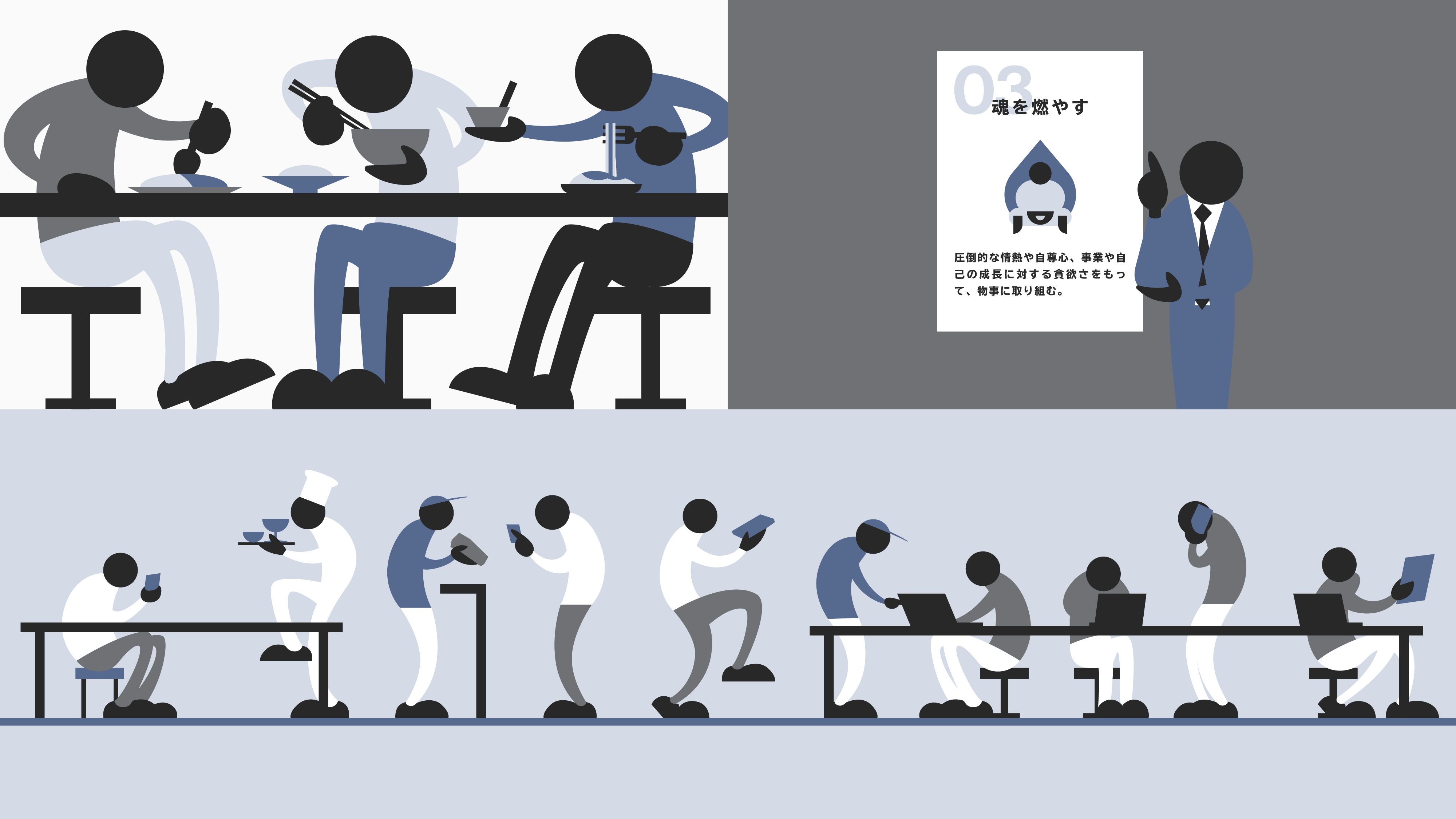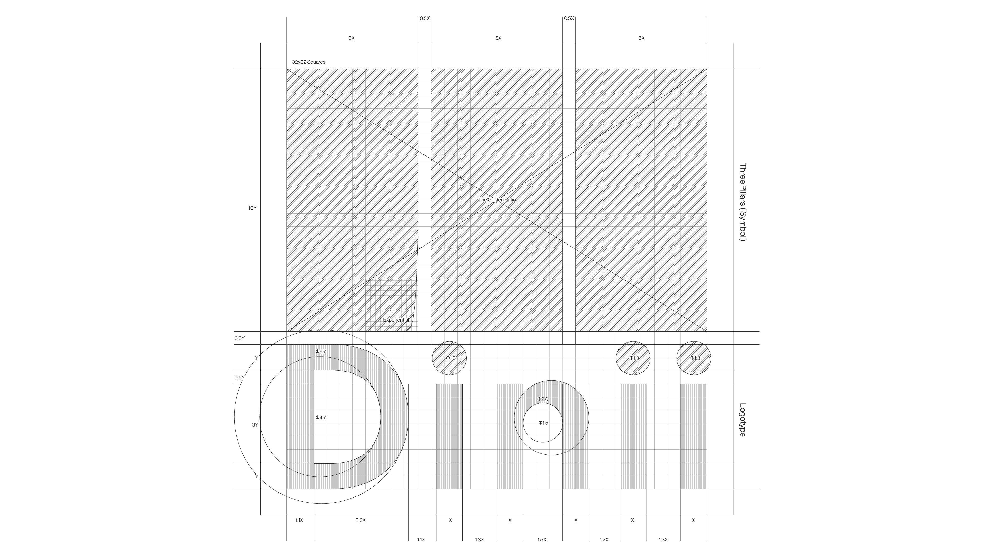 面を切り出したような幾何学的なロゴですが、のれんがめくれる箇所には、指数関数曲線を導入。柔らかな曲線を組み合わせることで、オーセンティックでありながら温かみのある印象を演出。外食産業が指数関数的に成長する願いも込められています。