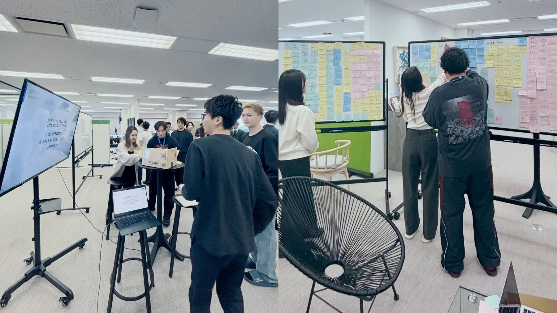 まずは、社内の全メンバーに対してヒアリングを実施しました。とはいえ、全員に個別インタビューを行うのではなく、ワークショップ形式で実施しました。「メディアエイドらしさとは?」 という問いに対し、各メンバーが匿名で3つ以上のワードを付箋に書く方式を取りました。