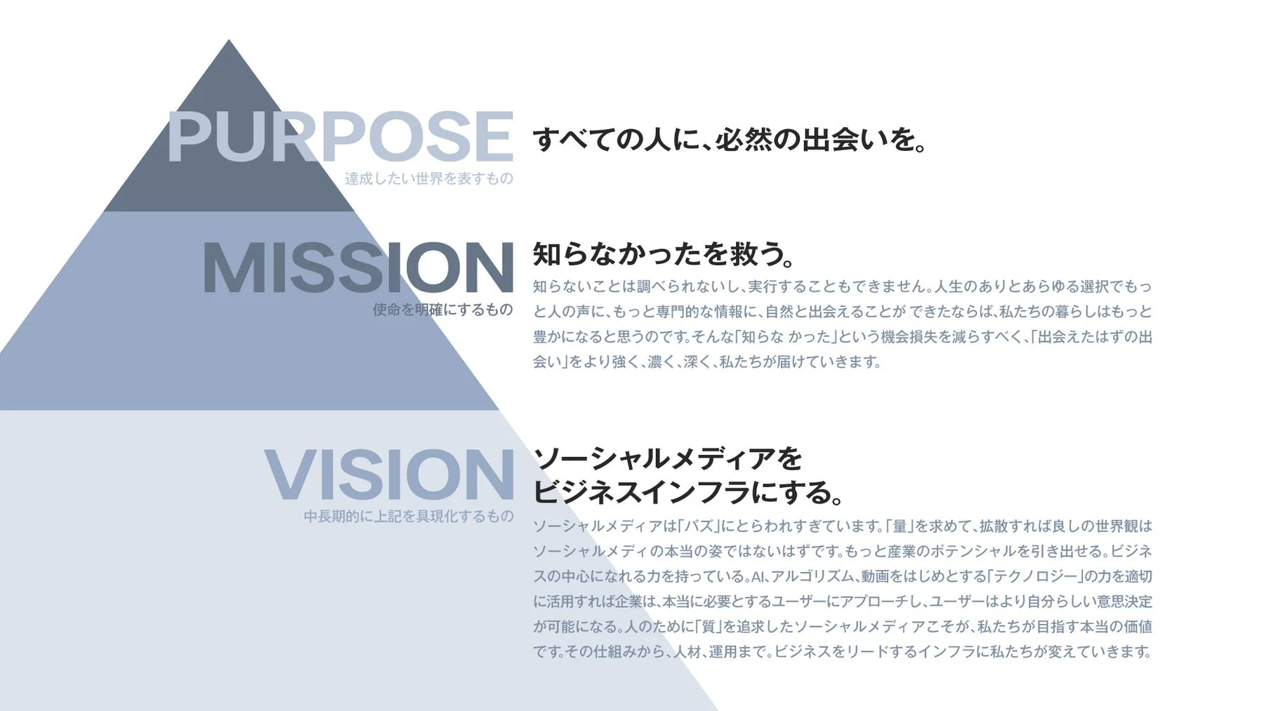 今回一番の悩む点であった(大きくテコ入れした)既存のミッションの抽象度が高い点「すべての人に、必然の出逢いを。」をより具体的なミッション「知らなかったを救う。」へ再定義し、既存のミッションをパーパスを新設することで、PMVVへ再整理しました。