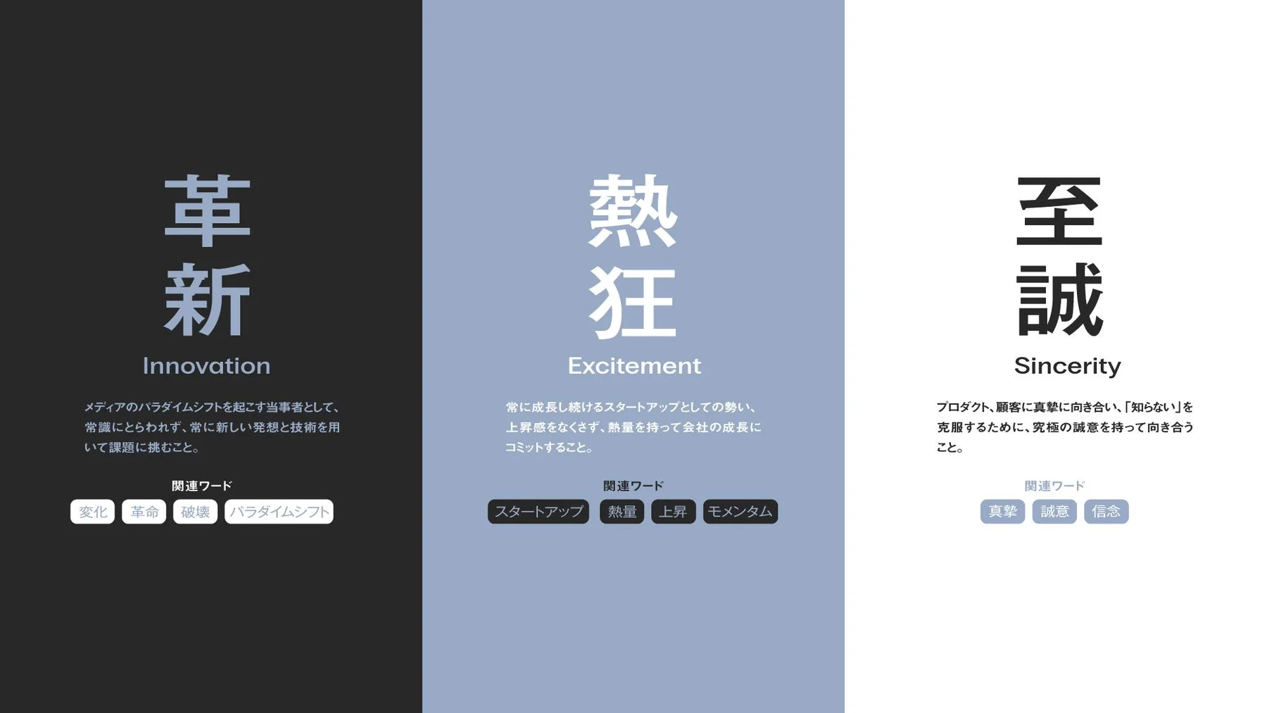 ワークショップで多く挙げられた「熱量」に関する意見を反映し、これまでも兼ね備えていた勢いや若々しさを活かした「熱狂」。ソーシャルメディアの変革を起こすために必要な「革新」。そして、一番向き合うべき利用者、いわゆるすべての人への姿勢を示した「至誠」としました。