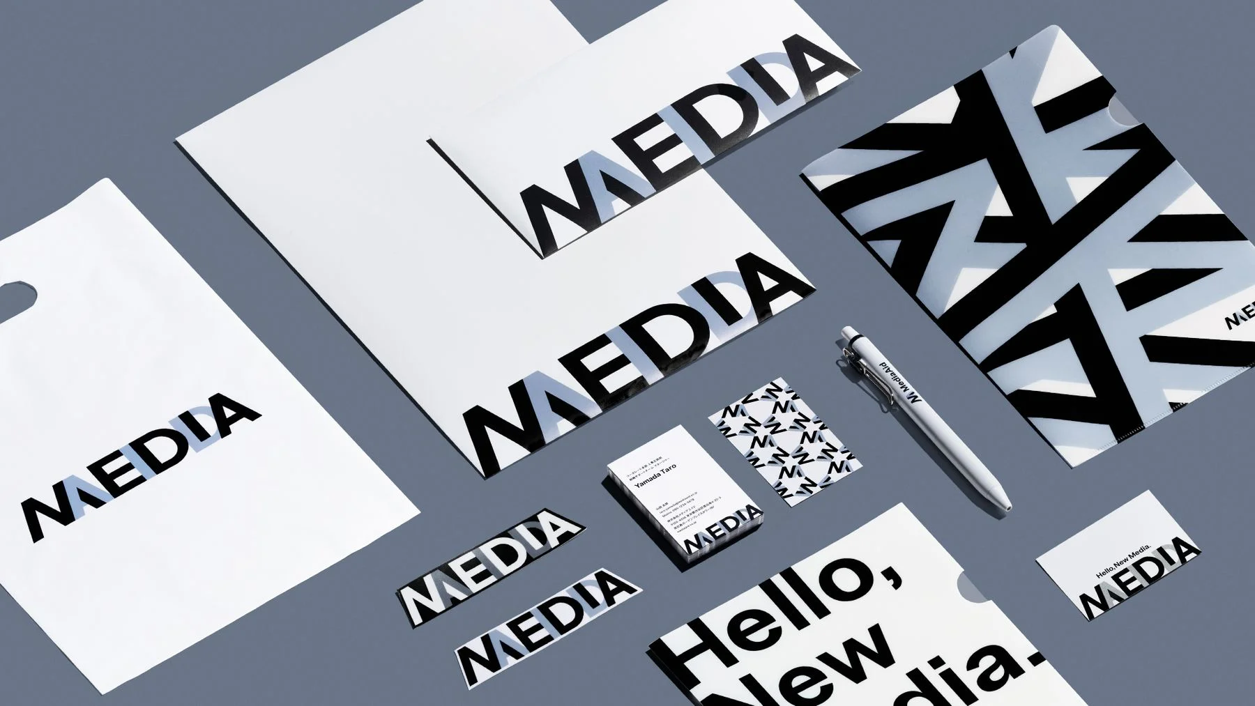 グラフィックへの順応を意識したブランドロゴの構築は、豊富な基本デザイン要素を生み出しました。無彩色でありながら、効果的な展開でブランドコアの「熱狂」までもれなく再現。使用シーンに合わせて柔軟に「メディアエイドらしさ」を象っていきます。