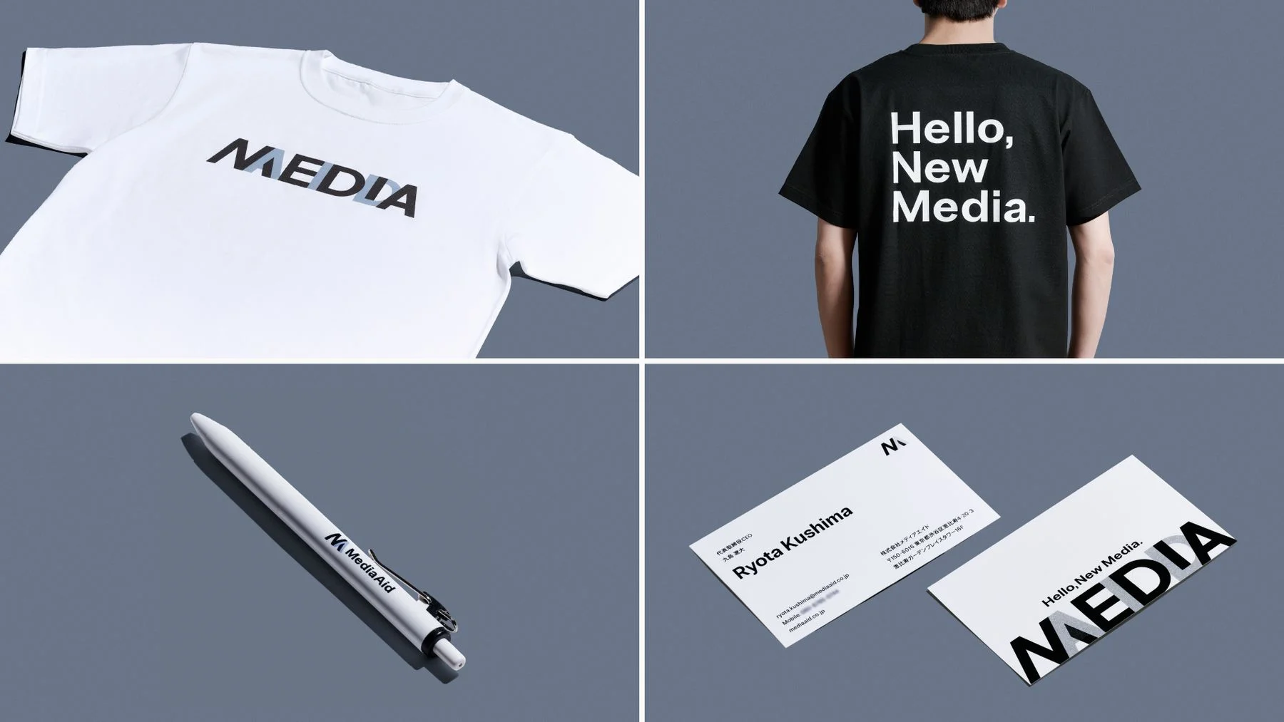 ロゴマークには、洗練された印象のブルーグレーとブラックを採用。さらにサブカラーとしてバイオレットを加えることで、メディアエイドが目指す革新的な未来を予感させる配色としています。