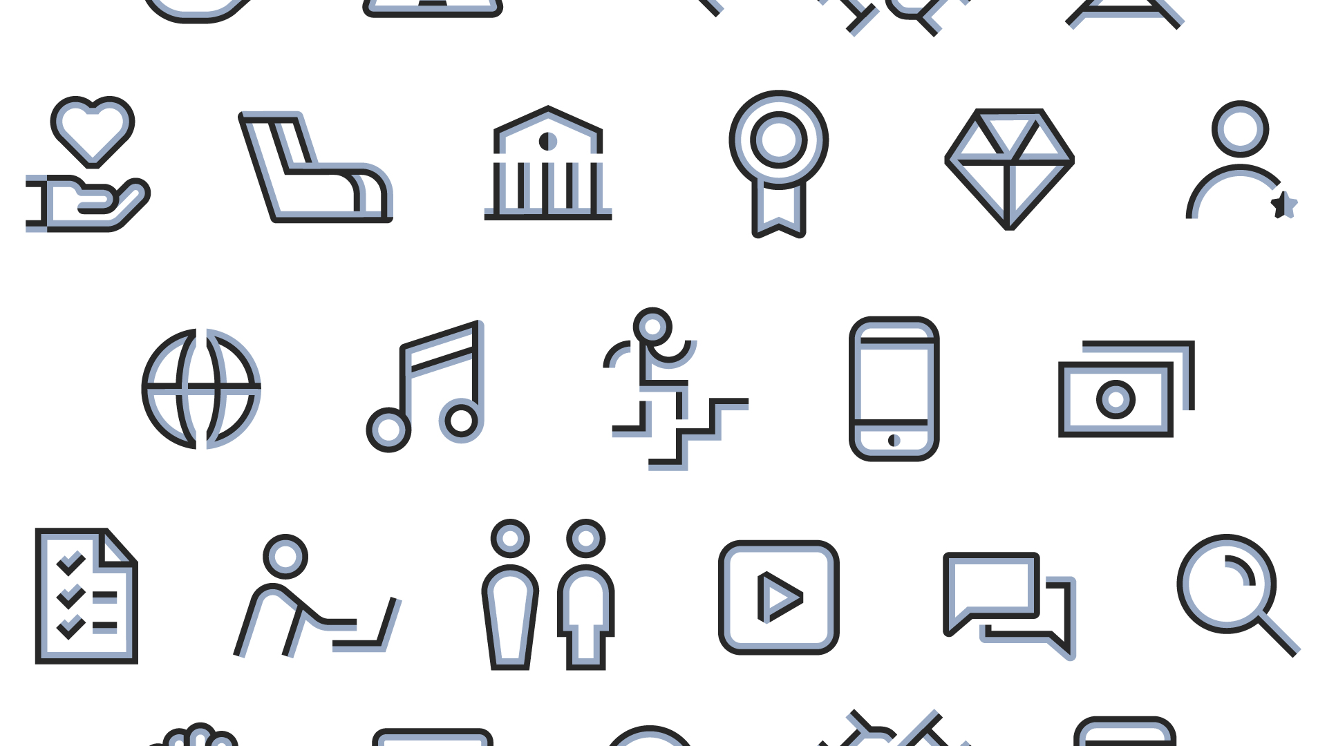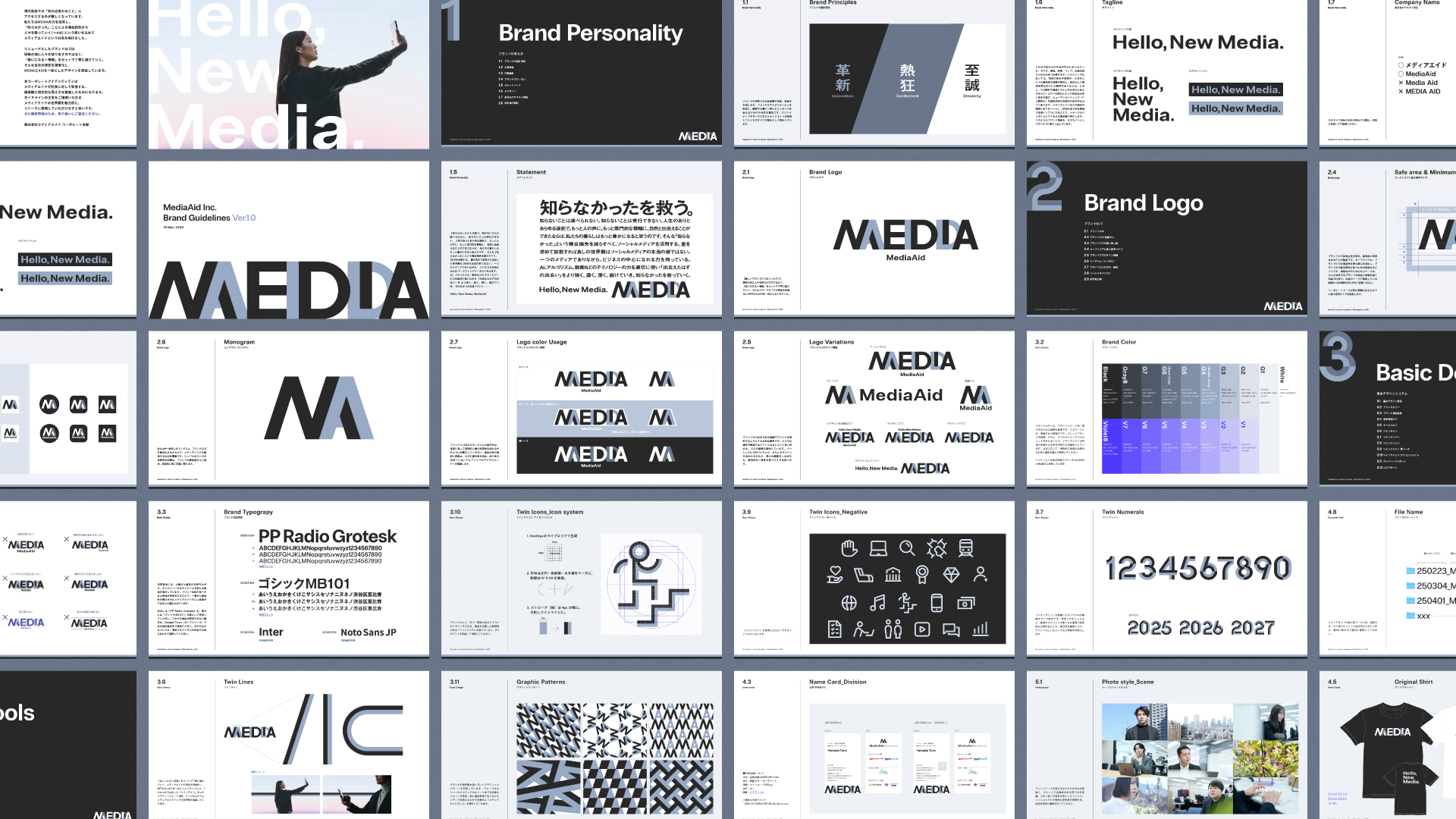 「救いになる+情報」をセットで丁寧に届けていく。メディアエイドの理念を視覚化しMEDIAとAIDを一体としたブランドロゴ。このロゴから抽出した「ツインライン」をコアグラフィックとして採用。シンプルながらもメディアエイドとしての世界観を構築していきます。ツインラインを基軸に、ロゴの設計に準ずる形で、タイポグラフィ、アイコン、グラフィックパターンへと姿を変えていきます。