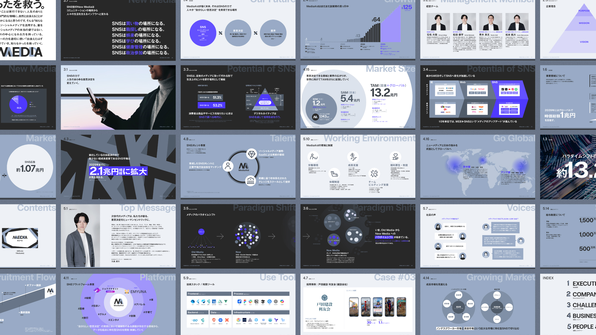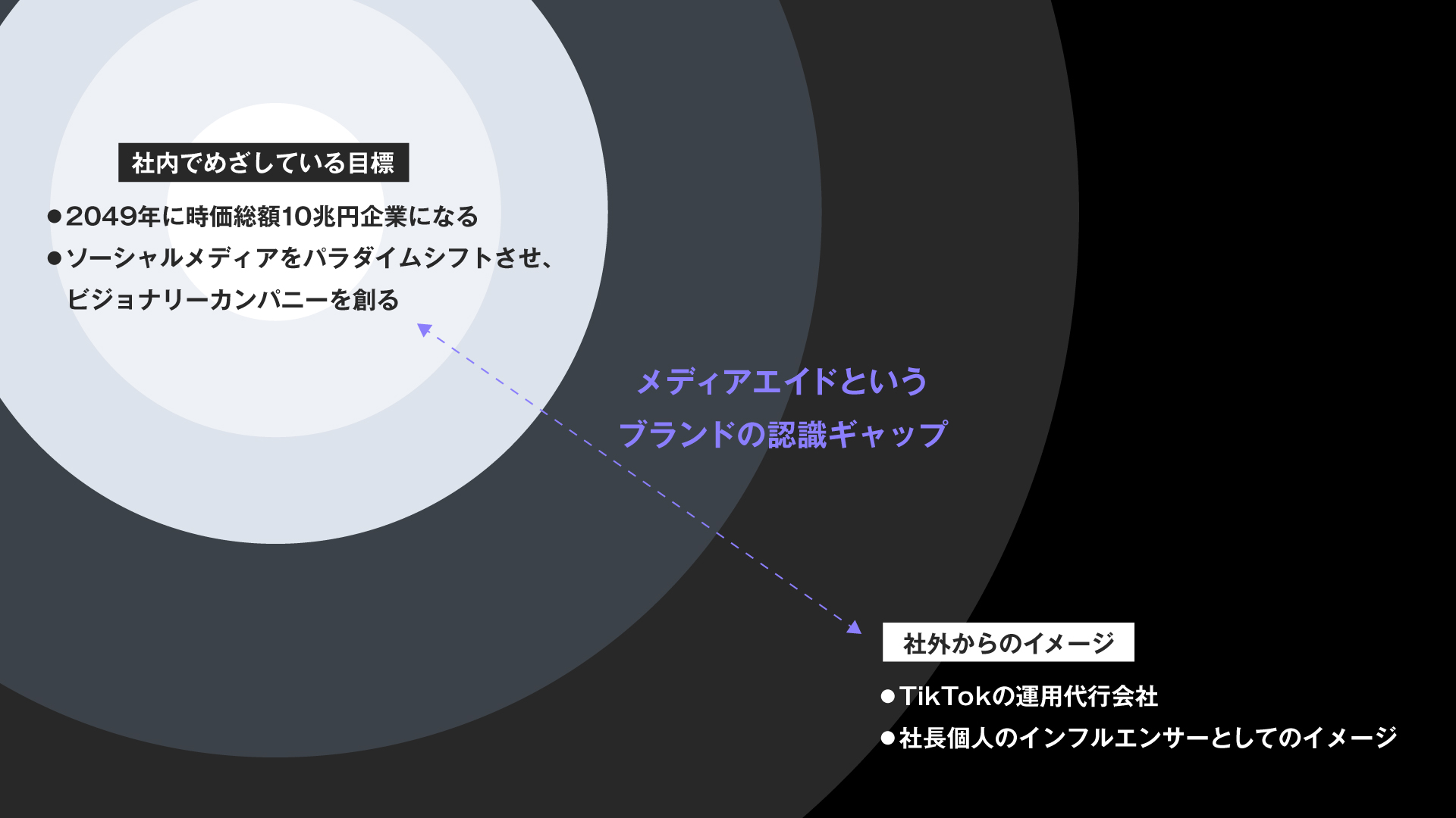 メディアエイドは、「ソーシャルメディアをパラダイムシフトさせ、ビジョナリーカンパニーを創る」という大きな挑戦を掲げています。しかし、現状ではそのビジョンが十分に伝わっていませんでした。特に、外部からは「TikTokの運用代行の会社」というイメージが先行しており、本来の事業の広がりや価値が正しく認識されていませんでした。また、代表個人のSNSでの発信が強く印象づけられていたため、会社として目指す世界観や本質的な魅力が適切に伝わっていなかったのです。この課題を解決し、企業としての存在意義をより明確にするために、リブランディングを実施しました。