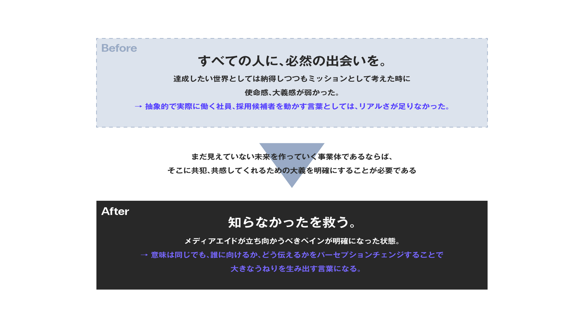 そこで既存のミッションを上位概念であるパーパスに再設定し、メディアエイドが立ち向かうべきペインを「知らなかったを救う。」というミッションとして新たに策定し、企業としての方向性がより明確な状態になりました。誰に向けるか、どう伝えるかをパーセプションチェンジすることで大きなうなりを生み出す言葉にしました。