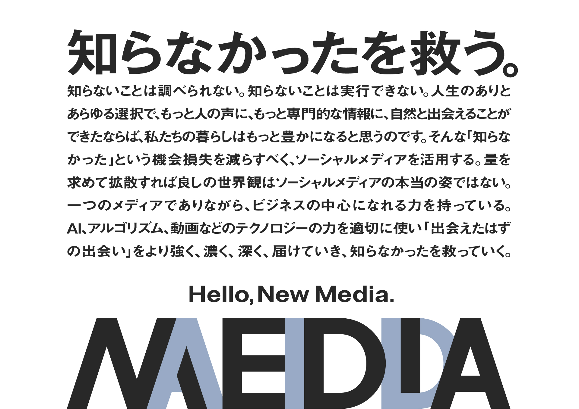 TikTokやInstagramなどのソーシャルメディアを活用し、企業の集客や採用支援を行ってるメディアエイド。2021年4に設立されたSNSマーケティングスタートアップです。会社として次のステージに進むにあたり、社内外の声を取り入れて、企業の存在意義や事業戦略を再定義。SNSを通じて情報の非対称性を解消し、企業と消費者の出会いを最適化していく=「知らなかったを救う。」という言葉をキーワードに、コーポレートブランディングを行いました。