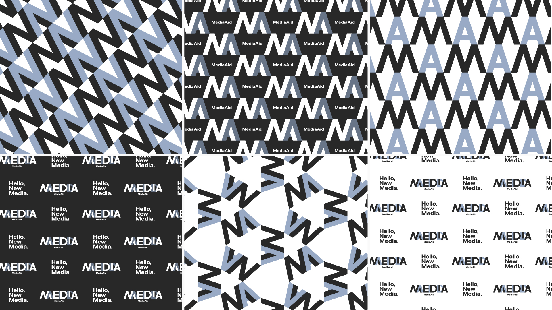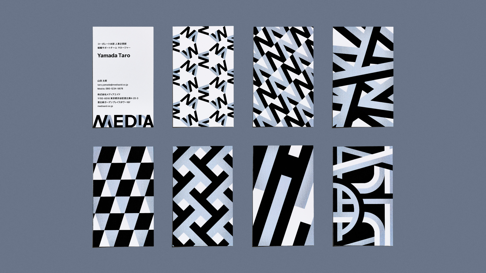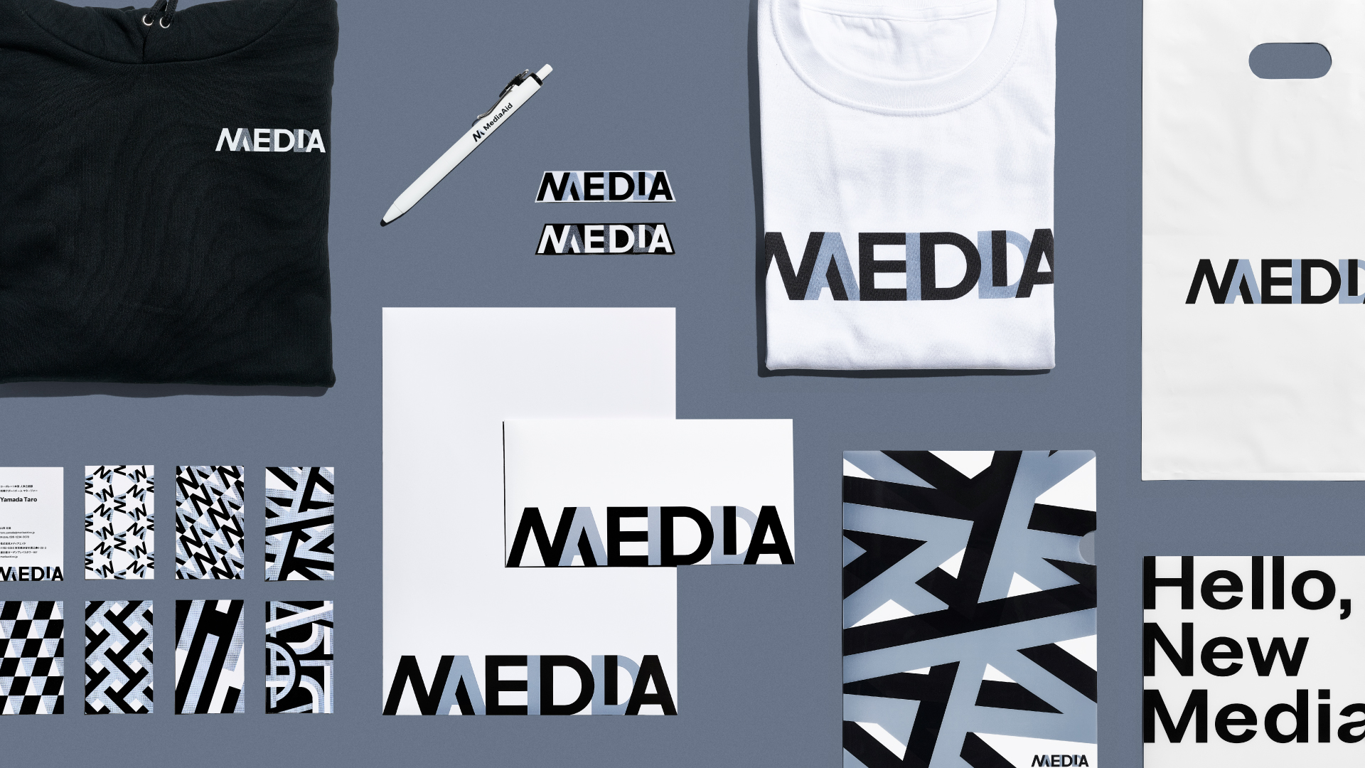 グラフィックへの順応を意識したブランドロゴの構築は、豊富な基本デザイン要素を生み出しました。無彩色でありながら、効果的な展開でブランドコアの「熱狂」までもれなく再現。使用シーンに合わせて柔軟に「メディアエイドらしさ」を象っていきます。